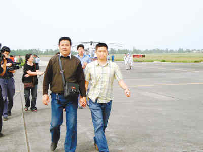 One of the survivors (L) meets his younger brother at the Guanghan Airport May 28, 2008. [People's Daily]