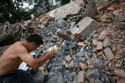A Chinese earthquake survivor crushes the debris of his home with a sledge hammer to remove the steel bars from the cement in Hanwang Sunday, May 25, 2008. More than two weeks after the massive tremor that claimed at least 65,000 lives, the search is no longer for the missing and the dead. Instead, survivors are struggling to support their families in one of the very few ways they can --scavenging for scrap metal. [Agencies]