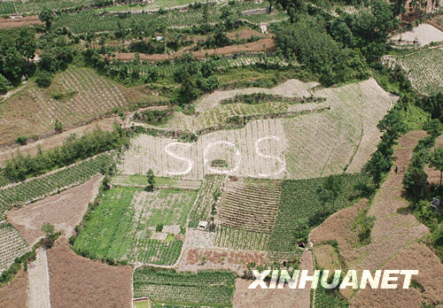 An aerial view shows an SOS sign made in a farmer’s field at avillageofBeichuancounty, May 28, 2008. Heavy rains increased the water level of the Tangjiashan quake lake, formed when a landslide triggered by the May 12 quake blocked the Jianjiang River. [Xinhua]