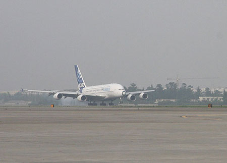 An Airbus A380 carrier carrying more than 1,100 tents for people left homeless by the 8.0-magnitude earthquake arrives in Chengdu, Southwest China's Sichuan Province, May 31, 2008. [eastday.com]
