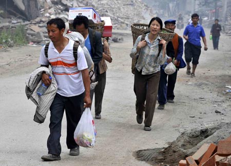 Quake survivors return to their home in Leigu Town of Beichuan County, Southwest China's Sichuan Province, May 24, 2008. [Xinhua]