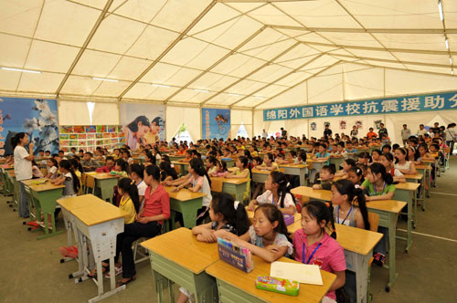 Pupils have a class in their camp classroom in Jiuzhou Stadium in Mianyang City of Sichuan Province May 23, 2008. Nearly 1,000 students from the neighboring quake-affected areas have resumed classes in the temporary camp school. [Xinhua]