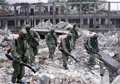 Soldiers disinfect the debris of the collapsed Beichuan Middle School in Beichuan County, southwest of China's Sichuan province, May 24, 2008. [Agencies]