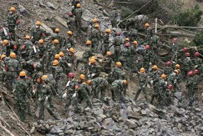 Soldiers work to reinforce the bank of the Tangjiashan lake in the quake-hit Beichuan county, Sichuan province May 30, 2008. [Agencies]