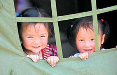 Wang Qiqi (left) and Wang Qian peep through the window of their tent at a resettlement zone in the town of Zhuyuan in Sichuan, June 2, 2008. More than 800 survivors are being housed in 90 tents at the site, which also provides them with food and water. [China Daily]