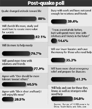 The poll, conducted by newspaper China Youth Daily and news portal Sohu.com, showed that 88 percent of the 4,309 people surveyed thought that the quake had "changed" their lives.