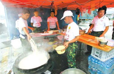 Volunteers from Zhengzhou, Henan province, cook noodles at their temporary noodle stand in Dujiangyan, Sichuan province. The noodles are free for people in the quake-hit areas. [China Daily]