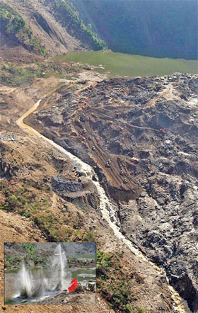 A bird's eye view of the Tangjiashan quake lake, where soldiers and engineers widened and deepened the diversion channel on Saturday so that water could flow out more rapidly. Inset: An explosion is triggered in the diversion channel of the lake to clear debris and allow freer flow of water. [China Daily]