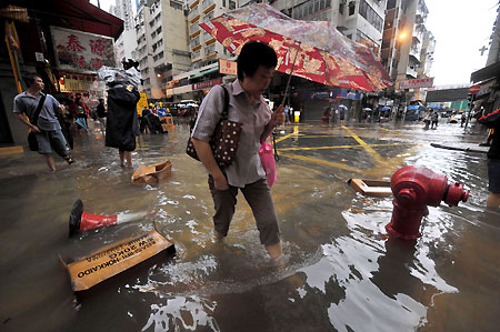 People wade through knee-deep water on a Hong Kong street after the city was lashed by rainstorms as was most of South China yesterday. So intense was the downpour in Hong Kong that its weather office had to issue the highest rainstorm warning. [Xinhua] |