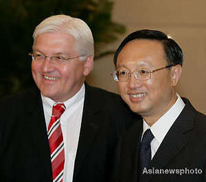 Foreign Minister Yang Jiechi meets his German counterpart Frank-Walter Steinmeier in Beijing on Friday. [Asianewsphoto]
