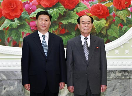 Visiting Chinese Vice President Xi Jinping (L) meets with Kim Yong Nam, president of the Presidium of the Supreme People's Assembly of the Democratic People's Republic of Korea (DPRK), in Pyongyang, capital of DPRK, June 17, 2008. [Xinhua]