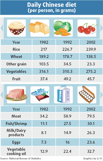 Booming business for self-employed garment seller Qiao Sheng in Qianqiao town, Anqing, Anhui province, has not only been fattening his bank account by the week, but also enriched his family's dinner table. "I grew up mostly on salted vegetables - made without oil - during my childhood," said Qiao, in his 40s. "Now, as life gets better, I want my children to be better fed, stronger and healthier." Many in town seem to share Qiao's sentiments. Fifteen years ago, Qianqiao had just one pork seller. Today, there are five of them to feed the surging demand for meat. It is one example of how, along with the country's economic growth, changes in diet that started with urbanites have spread to farmers such as Qiao. Each person in the country now consumes 5 percent more meat, 10 percent more milk and 8 percent more cooking oil annually than five years ago, figures from the National Bureau of Statistics have shown. Improvements in diet had already been making an impact. A survey by the Ministry of Health in 2002 showed that the average height of children between the ages of 3 and 18 rose 3.3 cm between 1992 and 2002. The rate of malnutrition among the children dropped by more than half in the same period. However, amid a surge in global food prices, a number of fingers have pointed to changes in Asian diets including those in China as the culprit for the food price hikes. A number of US economists, for example, have said that a major reason for soaring food prices is the increasing demand for meat and dairy products in China and India, the two most populous countries. Since it takes 7 kg to 8 kg of grain to produce 1 kg of meat, higher meat and dairy consumption is said to require more grain. With Chinese eating more meat, drinking more milk and using more cooking oil, there is also a corresponding spike in demand for feed to produce a growing population of pigs and other livestock, critics have said. Industry publication Biofuels Digest editor Jim Lane said in a report that "an additional 277 million tons of grain would be needed to support China at parity with the US. That would take 68 million acres to grow. "There is not that kind of arable land available anywhere in the world, whether we use grains for renewable energy or not." The logic behind Lane's claim is questionable, experts have pointed out. There is no reason for Asian countries to follow the meat-based diet of the West, they say. "It is irrational to analyze the diet changes in China based on an American model," said Lu Zhiming, an academic with the Shanghai-based Fudan University. Put simply, Asian countries including China and India are not used to eating the same amount of meat and dairy products as their Western counterparts, consuming limited amounts of grain for feed as a result, Lu said. After all, China is still a net exporter of agricultural produce, he said. The average grain consumption of one American is six times that of a person in India, about 1,076 kg, statistics from the US Department of Agriculture have shown. The foods that make up a Chinese diet are varied and do not revolve around meat, said He Xuezhong, chief analyst with the Beijing-based Orient Agribusiness Consultant Ltd, China's sole agriculture consultation company and a subsidiary company under the NASDAQ-listed Xinhua Finance. The daily intake of meat, poultry and seafood for each Chinese in 2002 was 109.6 g, or about 40 kg a year, a survey jointly released by the Health Ministry, Science and Technology Ministry and National Bureau of Statistics has shown. Americans remain the biggest meat consumers, with each person eating about 80 kg of meat, fish and poultry a year, statistics from United Nation's Food and Agriculture Organization have shown.