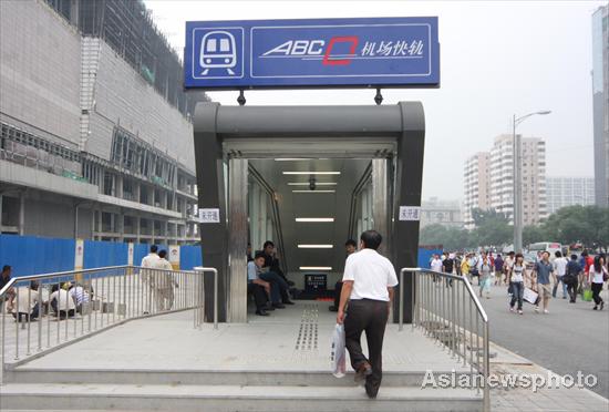 A passenger looks into the entryway of an express line to the Beijing Capital International Airport at Dongzhimen metro terminal in downtown Beijing June 26, 2008. The new line will officially start running on July 1. [Asianewsphoto]