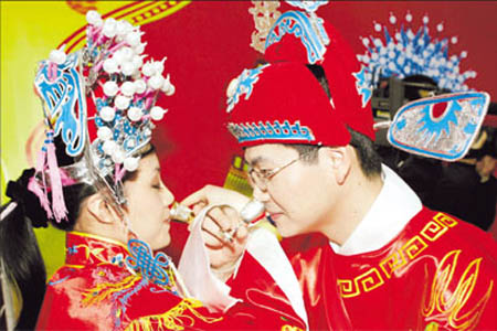 A couple has Jiao bei jiu (union of wine cups) during their wedding. It is one of the must-dos in a Chinese wedding. [Shanghai Daily]
