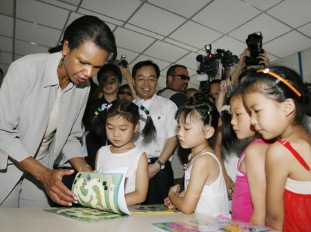 US Secretary of State Condoleezza Rice (L) looks at a children's book at a reading room of a temporary camp during her visit to quake-hit Dujiangyan, Sichuan province June 29, 2008. Rice paid respect to victims of the massive May 12 earthquake in Sichuan before heading to Beijing to meet Chinese officials. [Agencies]