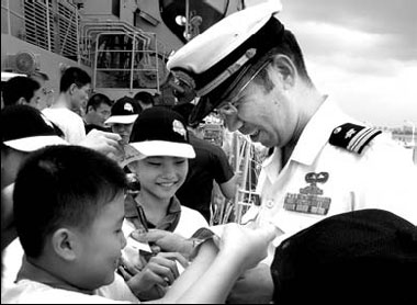 A crewmember from the Japanese destroyer Sazanami signs autographs for Chinese students in Zhanjiang, Guangdong province, on Friday, during the vessel's five-day stay in China. It was the first time for a Japanese naval ship to visit China in six decades. [Li Xiaokun/China Daily]