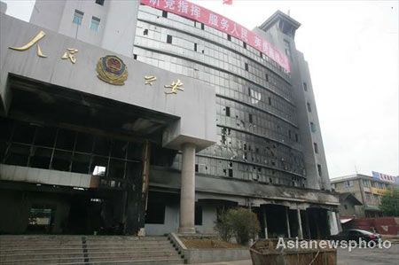 The burnt-out Weng'an public security bureau in Guizhou province, which was set ablaze and ransacked by locals, is shown in this picture taken on July 2, 2008. [Asianewsphoto]