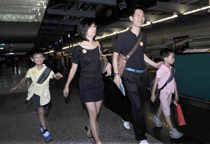 A family from Taiwan walk to the boarding gate to take the first direct chartered flight from Guangzhou to Taiwan July 4, 2008. The flight took off at 6:30 am on Friday. A total of 353 people will fly from Beijing, while four other groups, each comprising 100 travelers, will leave from Shanghai, Nanjing, Xiamen and Guangzhou. [Xinhua]