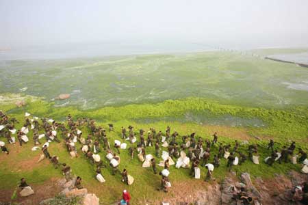 Soldiers join to remove green algae from the sea at Qingdao July 3, 2008. The city will host the Olympic sailing events. [Ju Chuanjiang/China Daily]