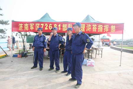 Officer Liu Shuntang (R), from a military unit stationed in Qingdao, directs the efforts to remove green algae from the sea at Qingdao July 3, 2008. The city will host the Olympic sailing events. [Ju Chuanjiang/China Daily]