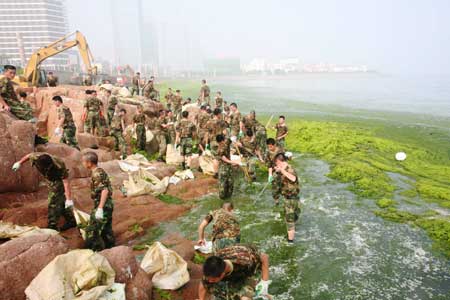 Soldiers join to remove green algae from the sea at Qingdao July 3, 2008. The city will host the Olympic sailing events. [Ju Chuanjiang/China Daily]