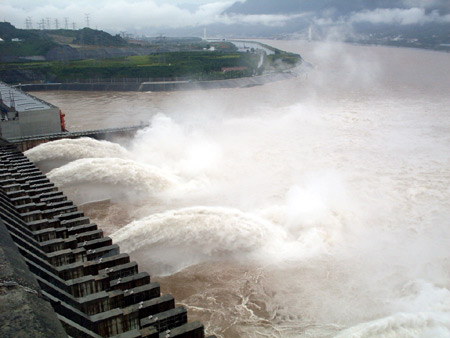 Flood is discharged from the Three Gorges Reservoir through the dam in Yinchang, central China's Hubei Province, July 5, 2008. The Three Gorges Dam Project has started discharging water to lower the water level in the reservoir because of excessive rainfall upstream. Operators opened six spillways to discharge water of 11,000 cubic meters per second. [Xinhua]