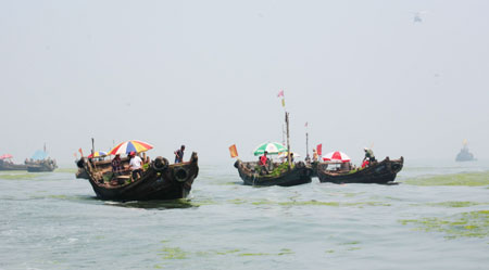 Workers collect and remove algae from the sea areas of Olympic sailing competition in Qingdao, Shandong Province July 6, 2008. With algae almost cleared, Olympic sailors begin to practise normally. [Ju Chuanjiang/China Daily]