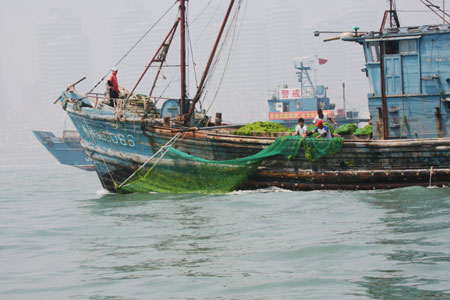 Workers collect and remove algae from the sea areas of Olympic sailing competition in Qingdao, Shandong Province July 6, 2008. With algae almost cleared, Olympic sailors begin to practise normally. [Ju Chuanjiang/China Daily]
