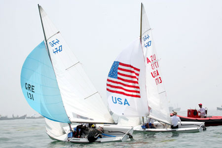 Foreign athletes practise for the Olympic sailing competition in Qingdao, Shandong Province July 6, 2008. With algae almost cleared, Olympic sailors begin to practise normally. [Ju Chuanjiang/China Daily]