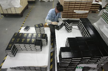 A worker packs new English language Bible books at Amity Printing factory in Nanjing, Jiangsu province July 8, 2008. Amity, China's biggest Bible producer, has made over 5 million Bibles for Chinese churches in the past two years and exported about 5 million copies in roughly 75 languages. The factory has printed 30,000 copies of the New Testament for free distribution during the upcoming Beijing Olympic Games. [Agencies]