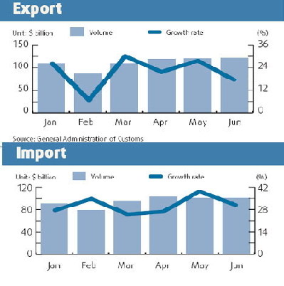 Trade balance and a structural adjustment of exports have been on the agenda of macro control measures initiated this year, and the recent trade data show these measures have started to work, said Gao. Figures of the first half show imports rose rapidly and composition of the export basket changed. In contrast with the export slowdown, imports went up 30.6 percent. Export of electronic and machinery products, which takes up over half of the overall exports, jumped 25.3 percent to $389 billion. Export of hi-tech products also increased rapidly, up 21.8 percent, to $196 billion. Export growth of products of energy-intensive and heavily polluting industries, by contrast, slowed down 16 percent. Although export slowdown in some sectors have raised the specter of bankruptcy and rising unemployment, Gao said the trade policy would remain stable and the government's stance of reining in energy-intensive and heavily polluting enterprises would not change. In June, export of garment and accessories slowed down by 15 percent to $9.8 billion, the lowest monthly increase this year. Export of garments for the whole year went up by only 3.4 percent to $49 billion. Apart from the tightening policies, causes for the slowdown also include a faster appreciation of the yuan against the US dollar, which has made Chinese products more expensive, and the rising raw material and labor costs. A US-led slowdown of the global economy has also cost Chinese exporters dear. As a result, over two-thirds of textile enterprises are suffering losses. The average profit rate in the industry for the first five months of the year was only 1.1 percent, according to the Ministry of Commerce. Enterprises are therefore seeking favorable government policies in these sectors. Some suggest a slower yuan appreciation or increased export tax rebate. A proposal by China National Textile & Apparel Council to the State Council reportedly seeks more export tax rebate on some textile products. Top leaders, including Premier Wen Jiabao and Commerce Minister Chen Deming, have visited enterprises in Zhejiang and Jiangsu, both major textile export bases. Many see in these visits seeds of a possible policy change for the rest of the year. "We'll continue to clamp down on energy-intensive and highly polluting industries, and will further investigate and evaluate the difficulties faced by some industries," said Gao when asked whether the tax rebate would be increased. |