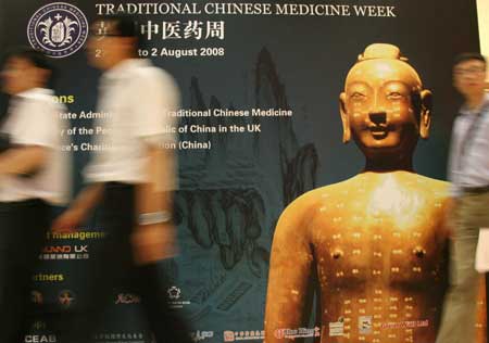 Visitors walk past a poster during the Traditional Chinese Medicine Week at the Royal Society of Medicine in London, Britain, July 28, 2008. The one-week event, starting from July 27, is aimed at promoting greater understanding and cooperation in medicine between China and the UK. [Xinhua]