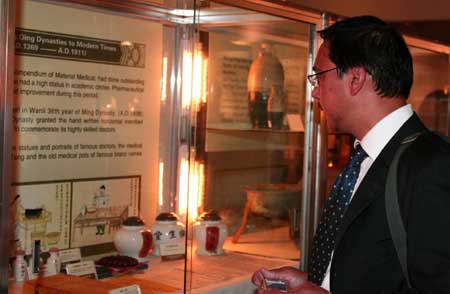 A visitor views a Chinese medicine exhibition during the Traditional Chinese Medicine Week at the Royal Society of Medicine in London, Britain, July 28, 2008. [Xinhua]