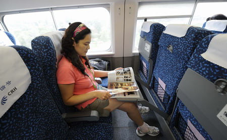 A journalist reads a magazine inside a train leaving for Tianjin from the Beijing South Railway Station, August 1 2008. [Xinhua]