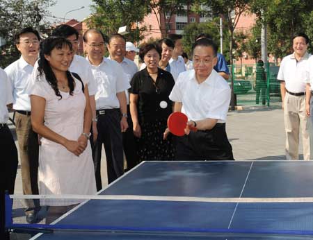 Chinese Premier Wen Jiabao plays table tennis with local residents at a community centre in the Fengtai District of Beijing, August, 3, 2008. [Xinhua]