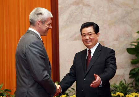 Chinese President Hu Jintao (R) shakes hands with President of the Republic of Serbia Boris Tadic during their meeting in Beijing, China, Aug. 7, 2008. [Xinhua]