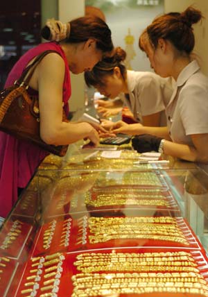 A customer chooses jewellery in Changchun, August 6, 2008. Platinum price in Changchun fell back sharply on Wednesday, dropping 10 percent to about 500 yuan per gram. [Xinhua]