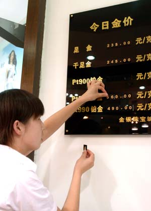 A saleswoman changes prices on a board at a jewellery shop in Changchun, August 6, 2008. [Xinhua]