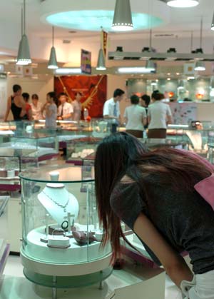 A customer chooses jewellery in Changchun, August 6, 2008. [Xinhua]