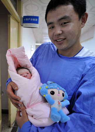 Proud father Wu Hongbin holds his new born baby girl on August 8, 2008 in Beijing, born at the Peking University First Hospital at 10:48am the opening day of the 2008 Beijing Olympic Games. As of late morning, some nine babies had been born at the hospital, with another three of four expected later in the day according to hospital staff. Her husband Wu Hongbin said he and his wife Yanmin will name the baby "Ao Yun", which means "Olympic." [Agencies] |