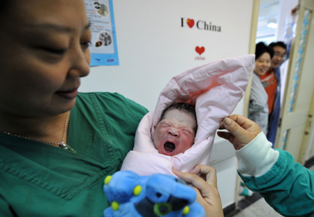Head nurse at the Peking University First Hospital, Liu Bin, holds a new born baby on August 8, 2008 in Beijing, born at 10:48am the opening day of the 2008 Beijing Olympic Games. As of late morning, some nine babies had been born at the hospital, with another three of four expected later in the day according to hospital staff. The father of the baby girl, Wu Hongbin, said he and his wife Shi Yanmin will name the baby "Ao Yun", which means "Olympic." [Agencies] |