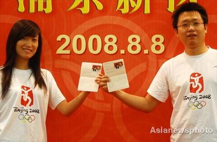 This year, August 8 is also the opening date of the Olympic Games in Beijing, giving it added cachet. Xue, who is also a volunteer for the Olympic Games, will patrol her neighborhood Friday night for security risks. "I will probably miss some part of the opening ceremony but it's okay. I can watch the recast tomorrow." Outside the registry office in Chaoyang district, love was in the air. Pink ribbons with balloons decorated on the gate. Red banners congratulating newly-weds were put up on the wall for this special occasion. Dozens of couples queued to get their marriage certificates. The office opened for business at midnight, said He Tieqing, spokesman for the district's Civil Affairs Bureau. "We were preparing our work and a couple came in, so we registered them," He said. Large groups started coming to the office at 6 a.m., two and half hours earlier than usual. "We chose this date because it's the opening of the Olympics. It's very memorable," said bride Tang Guinan. "We decided to marry on this day in 2003, when we were still in college. We were so happy when Beijing won the bid to host the Olympics in 2001." So many couples were planning to tie the knot on August 8 that Beijing's marriage registries set up an on-line service to file paperwork in advance and speed up the process. More than 16,400 couples booked their marriage certificates on August 8 in Beijing, according to the Beijing Civil Affairs Office. On August 8 last year, 3,390 couples were married in Beijing, making it the second most popular date after December 18 when 4,400 couples wed. Around the country, thousands of people were getting married on Friday; more than 5,000 couples registered in Shanghai, 3,300 in Guangzhou, 2,300 in Wuhan and 2,300 in Hangzhou, the Ministry of Civil Affairs said. Jiang Li, Vice Minister of Civil Affairs, said civil affairs bureaus should try to guarantee that all couples who wish to register on August 8 get their certificates. About 300 extra staff were added to helping the 18 marriage registration staff at Chaoyang's civil affairs bureau, where 2,418 booked registration, He Tieqing said. "It took only three minutes to register," said Tang Guinan. "The clerk checked our forms, gave us the certificates and congratulated us." "We will continue to work after the normal closing time of 6 p.m. if there are still couples to register," He said. "We will definitely make sure that every couple today will be registered." But despite the flood of weddings, many hotels and restaurants are had few bookings for wedding banquets. Usually Chinese couples register their marriage and hold wedding banquets on different dates. A staff member at the five-star Prime Hotel, on the renowned shopping street of Wangfujing in downtown Beijing, said it would take no reservations for wedding banquets until early September, because it was one of the contract hotels of the Olympic Games. Not every couple is rushing to catch the tide of "Olympic weddings". Chu Meng had planned earlier this year to get married on August 8, but she began to have doubts about the date after the devastating magnitude-8 earthquake hit Sichuan, southwest China, on May 12. "I heard the numbers of the date coincidentally added up to eight. It all sounds very superstitious, but there's no reason for me to risk having any bad luck for this important day in my life," said Chu, who works for a Canadian consulting firm. She finally changed her mind as the day approached. "The date has a triple eight. It's too perfect; I'm afraid that it will have the opposite result." Most couples delayed their wedding banquets to avoid the inconvenience of traffic controls and being upstaged by the Games opening ceremony, which will feature thousands of performers and extravagant fireworks. Wang Dongxiao, manager of the 168 Wedding Planning Company, said they declined work at more than 30 wedding banquets on Friday because of the restrictions on cars that only allow vehicles on the street with odd and even number on alternate days. "We only accepted four wedding banquets outside the Fifth Ring Road, where traffic control measures don't apply," he said. |