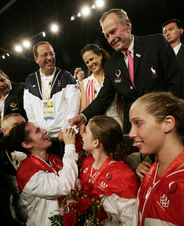 Former US president George H. Bush gives a handkerchief to Sada Jacobson of the US (L) as she poses with compatriots Mariel Zagunis (C) and Becca Ward after winning silver, gold, and bronze respectively, in the women's individual sabre fencing competition at the Beijing 2008 Olympic Games, August 9, 2008. [Agencies]