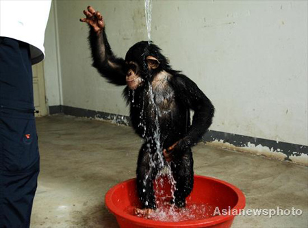 An animal caretaker gives a chimp a bath on a sweltering summer's day at a zoo in Hefei, East China's Anhui Province, August 11, 2008. [Asianewsphoto]