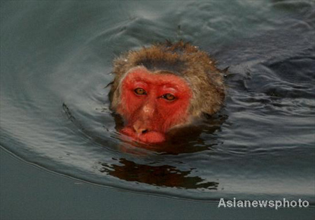 A monkey cools itself in a pond to escape the summer heat at a zoo in Hefei, East China's Anhui Province, August 11, 2008. [Asianewsphoto]