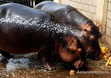 Two hippos get a shower on a sweltering summer's day at a zoo in Hefei, East China's Anhui Province, August 11, 2008. [Asianewsphoto]