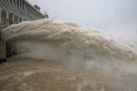 Flood water rushes through the sluice gates of the Three Gorges Dam in Yichang, central China's Hubei province August 13, 2007. The Three Gorges Dam opened its giant sluice to lower the water level in the reservoir as this summer's third flood crest passed through. [CFP] |