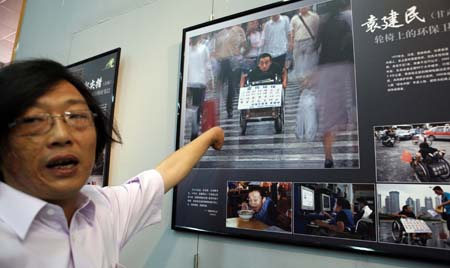 Zheng Longhua, a photographer without hands, introduces his works in a photo exhibition in Beijing. Born in 1956 in east China's Zhejiang Province, Zheng lost his both hands in his childhood and started his career of photography in 1981. [Xinhua]