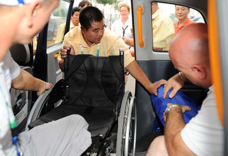 A volunteer helps move the wheelchair of French athlete Nicolas Peifer into a barrier-free taxi in front of the Main Press Center in Beijing Sept. 4, 2008. Many barrier-free facilities were installed in buses, taxis and subway stations, making it more convenient for disable people to get on and off. [Xinhua]