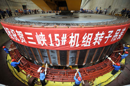 Updated: 2008-09-08 22:53 The 1,700-tonne turbine engine, a key part of the No. 15 generator of the Three Gorges Dam, is installed on September 8, 2008. [Xinhua] |